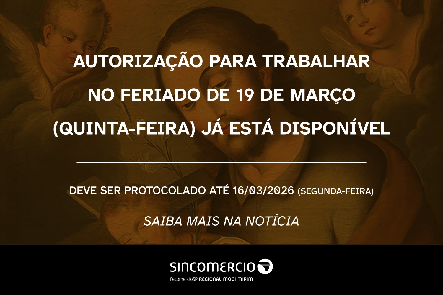 O SINCOMERCIO Mogi Mirim informa que já está disponível, o requerimento para negociação do trabalho e abertura do comércio no Feriado Municipal Religioso – Dia de São José – Padroeiro de Mogi Mirim, 19/03/2026 (quinta-feira).